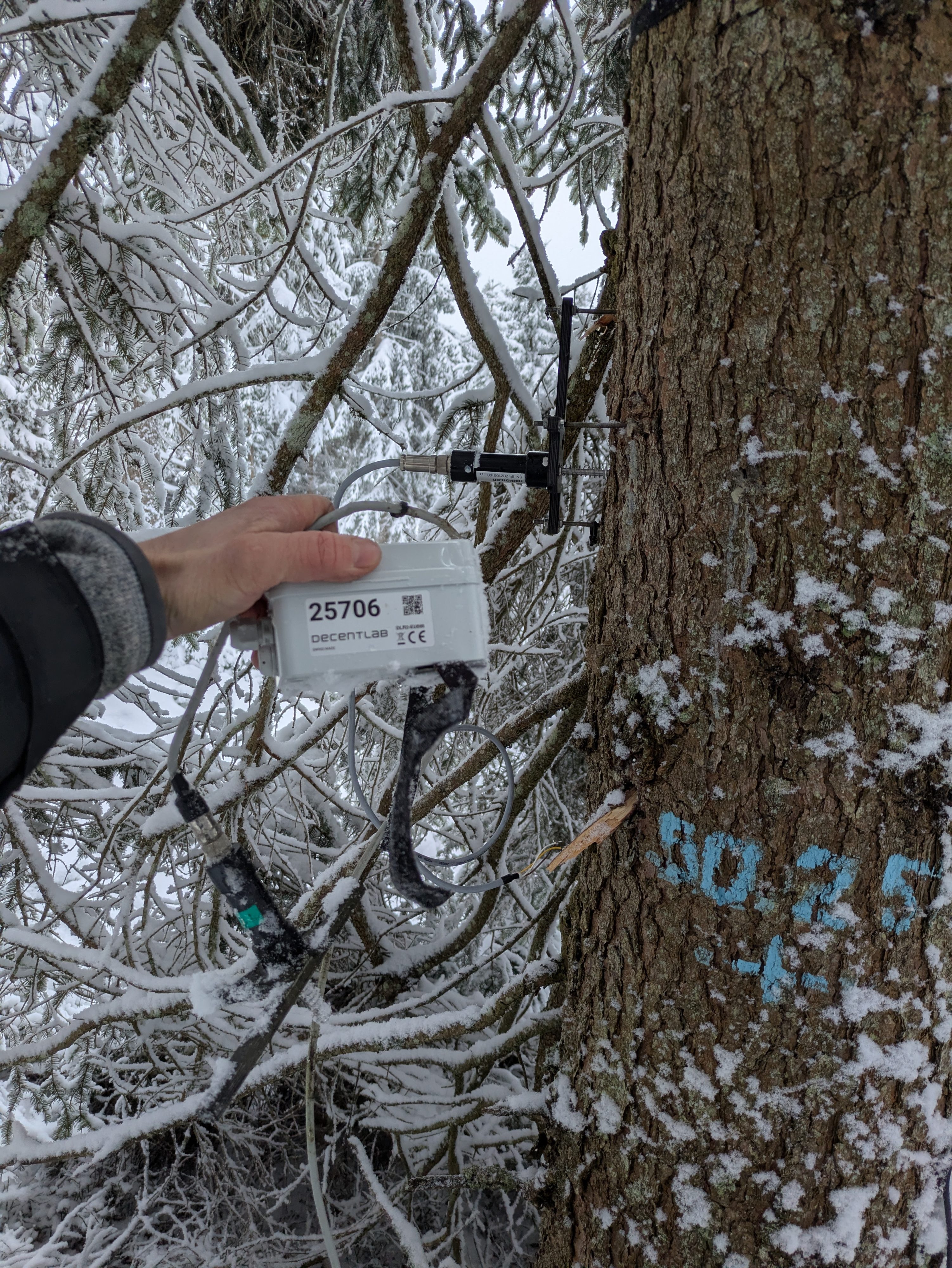 - Es wurde ein komplett neuer (aber alte Version) Dendrometer installiert, sowie ein neues Kabel mit Schraubverschluss, das aber oben verleimt ist. Da das Loch für die Position des Dendrometers abweicht vom alten Frame, ist er nun auch an einer “neuen” Stelle am Baum (obschon die Gewindestangen nicht gewechselt wurden!).
