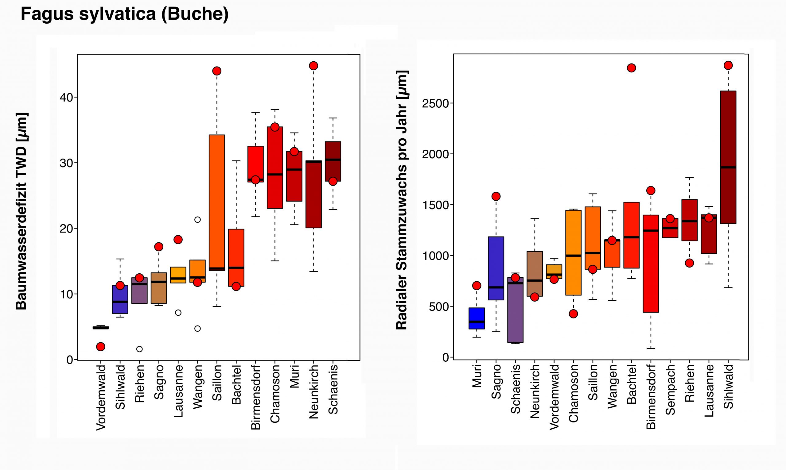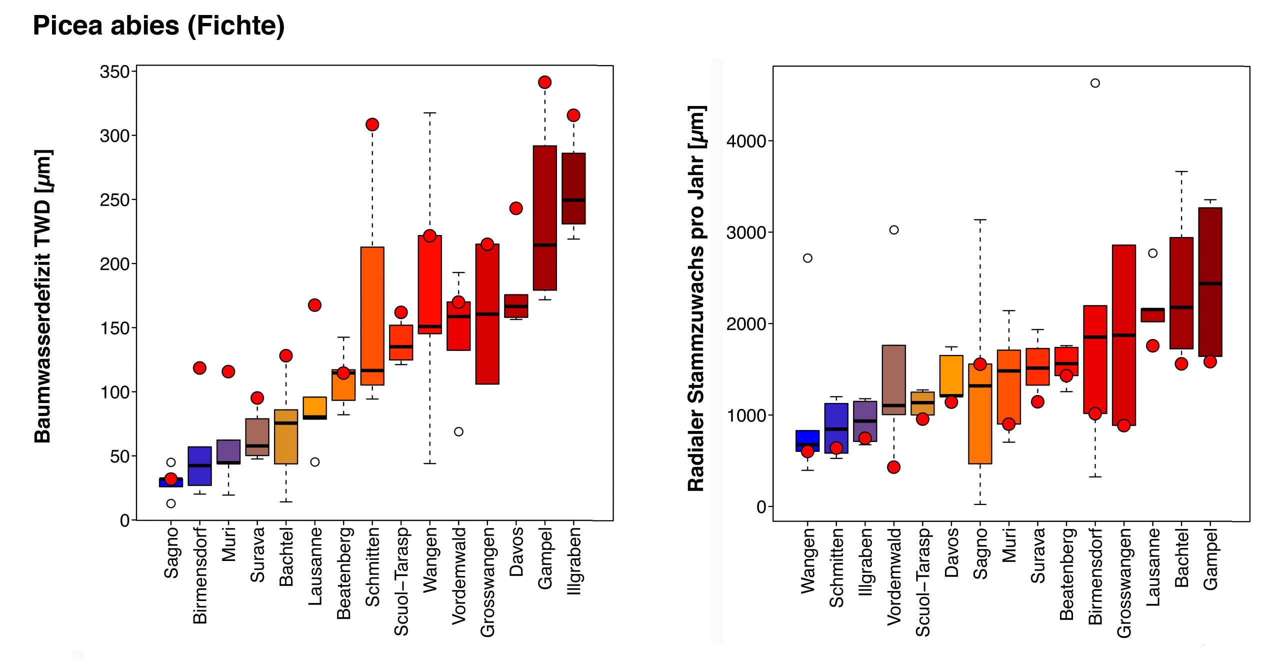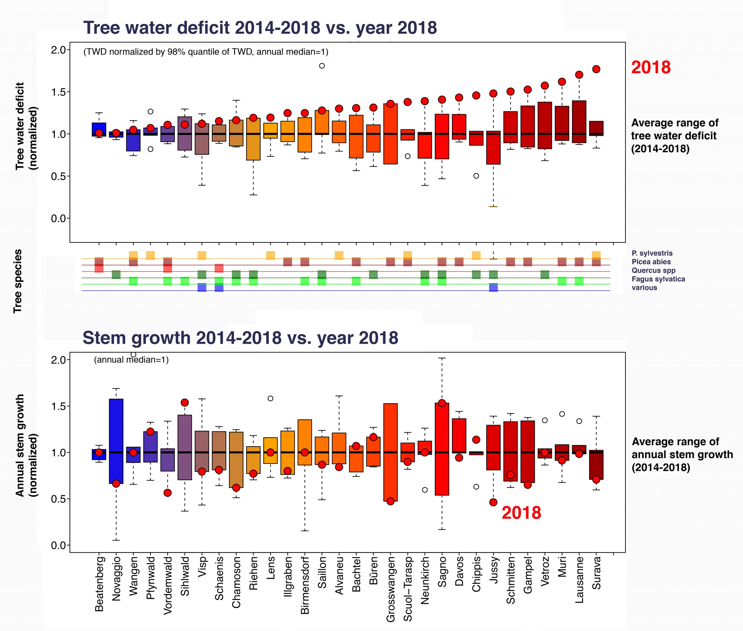 Radial stem growth responded much more heterogeneous than TWD to the dry and hot summer 2018. Trees at some sites had record-high radial stem increments in 2018 whereas other sites showed very low GRO. There is clear species-specific GRO responses to the year 2018. Spruce responded with low GRO in general whereas GRO of beech varied strongly.