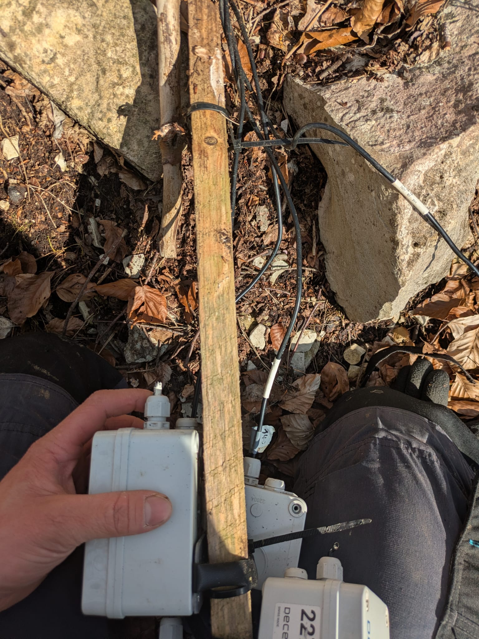 An beiden Bodenprofilen war eine Maus tätig, 22714 und 22713 Neunkirch-South-West und 22716 und 22719 an North waren zerbissen. Am Südlichen Profil waren die Kabelnummern noch zu lesen und konnten eindeutig zugeordnet und wieder angeschlossen werden. Profil Süd war zudem die kleine Holzlatte die Lorenz angebracht hat morsch und umgefallen. Es wurde ein neuer Pfahl dafür eingeschlagen. Am Profil Nord wurden die Kabel mehrfach zerbissen und die Nummerierung abgetrennt. Ich versuchte das Kabel zu rekonstruieren und denke es richtig gemacht zu haben. Im Sommer mal schauen ob die Kurven stimmen!! Sonst Kabel tauschen von 22716 (eigentlich 20 cm tief) und 22719 (eigentlich 150 cm tief). Sollte einfach zu entdecken sein da es sich zum Glück um den obersten und untersten Sensor handelt.